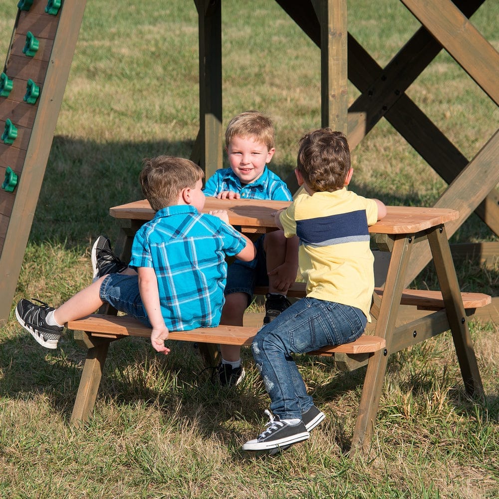 Hide-out, look-out, or camp-out? Even better than a tree house, the Eagles Nest Elite is the ideal swing set for whatever covert activities you can think of. With one of the most spacious and tallest clubhouses offered, this is the perfect combination of playhouse and kids swing set. Any little campers or climbers will gleefully spend endless hours running, scheming, and hanging out on the rock climbing wall or in the crow’s nest. Parents can rest easy letting their children swing away on our newly added patent pending extended swing beam and new heavy duty 26 inch belt swings for added safety and durability. The included web swing is a perfects combination of exercise and fun with our durable nylon rope to keep those little hands and feet safe.