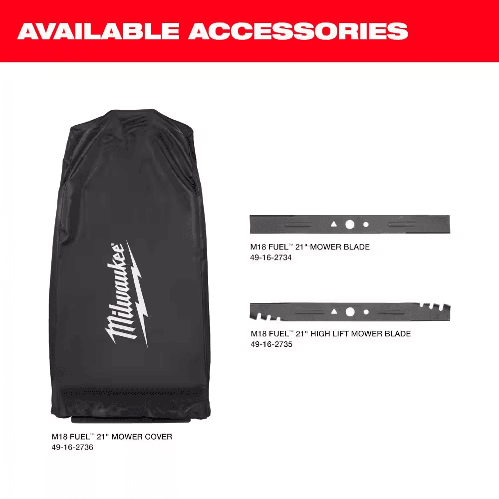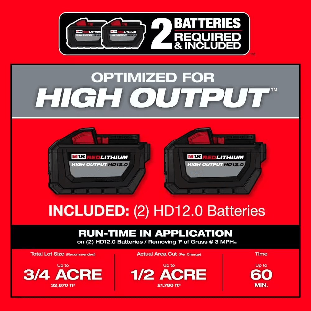 • Includes: (1) M18 FUEL Mower (2823-20), (2) M18 REDLITHIUM HIGH OUTPUT HD12.0 Battery Packs (48-11-1812), (1) M18 Dual Bay Simultaneous Rapid Charger (48-59-1802), (1) Mulch Plug, (1) Grass Bag, and (1) Rear Side Discharge Chute
