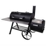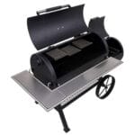The Oklahoma Joe’s 40-Inch Anthem Series Longhorn Reverse Flow Offset Charcoal Smoker (21202124) has been upgraded with exclusive Anthem Series features including stainless steel shelves and a custom smoker box for increased cooking versatility and rich wood-fired flavor. Built with versatility in mind, optional smokestack locations, and removable baffles that let you choose between reverse flow smoking for additional even heat and smoke, or traditional offset smoking. Equipped with a large charcoal basket, you can enjoy longer cooks with fewer interruptions. Plus, the convenient firebox door makes clean-up a breeze. The stainless steel accents for added style and performance. Expansive wrap-around shelf for ample workspace and convenient tool access. Oversized smokestack for increased airflow. Large temperature gauge to easily monitor cooking temperatures. Three Multi-Purpose Flex Racks for increased cooking versatility. Extra-large, 15-inch wagon-style wheels for easy mobility. 751-square-inches of primary cooking space; 309-square-inches of secondary cooking space. Optional smokestack locations let you choose between reverse flow smoking and traditional offset smoking. Four baffles locked under porcelain-coated wire grates deliver even heat and smoke through the cooking chamber. A large charcoal basket provides a more efficient burn, easier tending, and quick clean-up. A convenient firebox door makes clean-up quick and easy. Cool-touch handles with stainless steel accents protect your hands from the heat. Bottom shelf lets you keep cooking utensils and additional fuel close by.